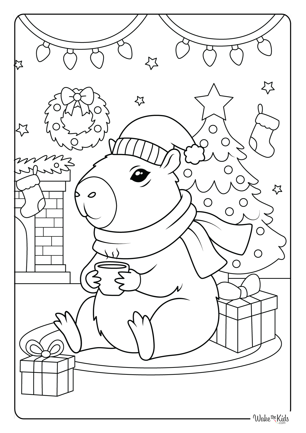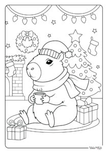 Festive scenes show capybaras among lanterns, flowers, and riverside decor, reflecting nature-themed celebrations. With shades of green, gold, or blue, young artists can capture the joyful warmth of the season while preserving their calm charm.