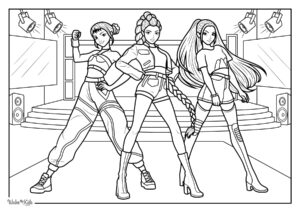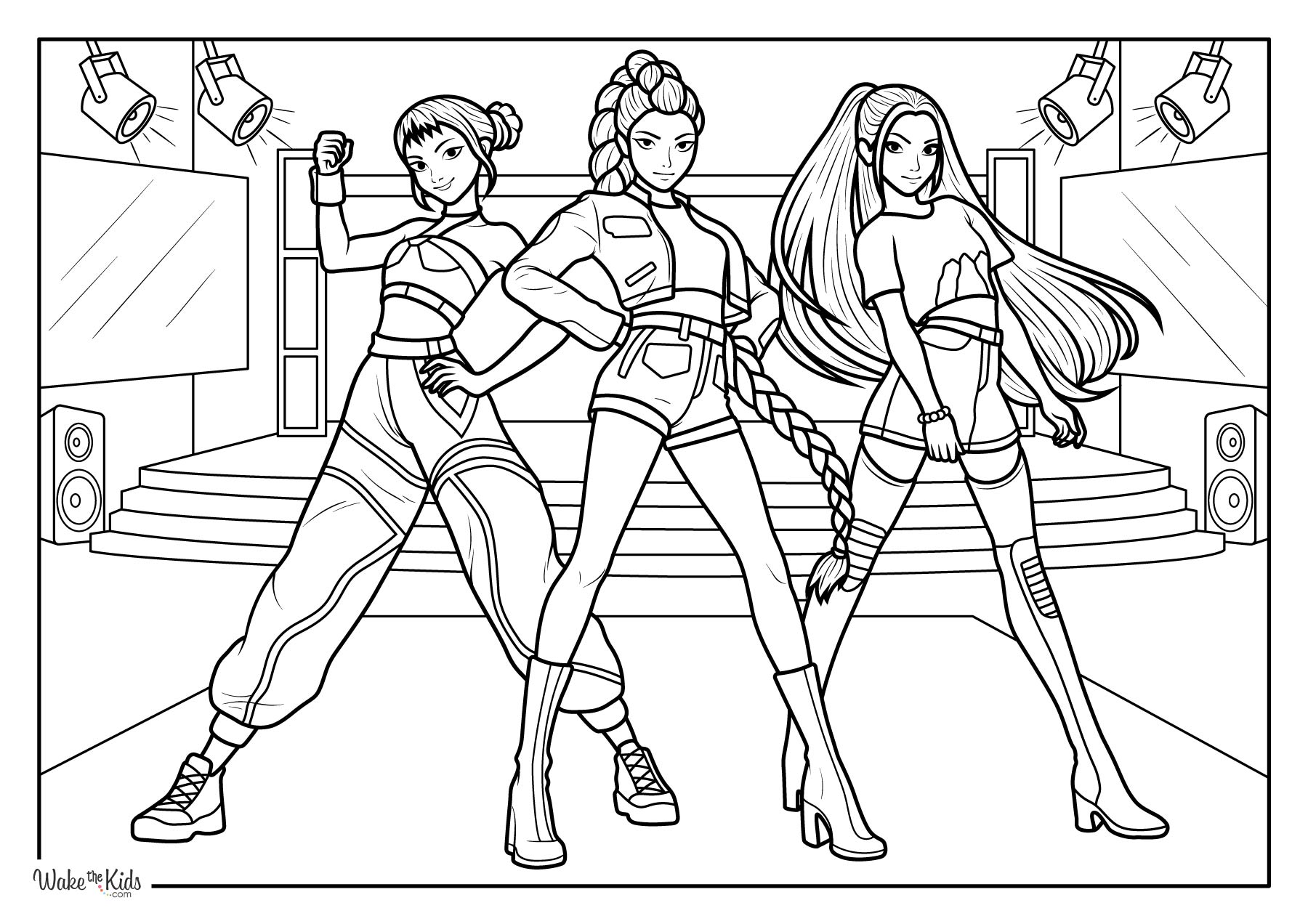 KPop Demon Hunters is an animated series that blends pop idol culture with supernatural action, set in a stylized world where performance and combat overlap. This look is reflected in the coloring pages through clear outlines, balanced spacing between characters and props, and compositions that stay visually open.