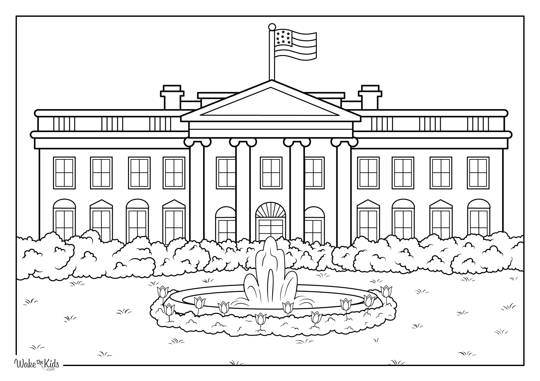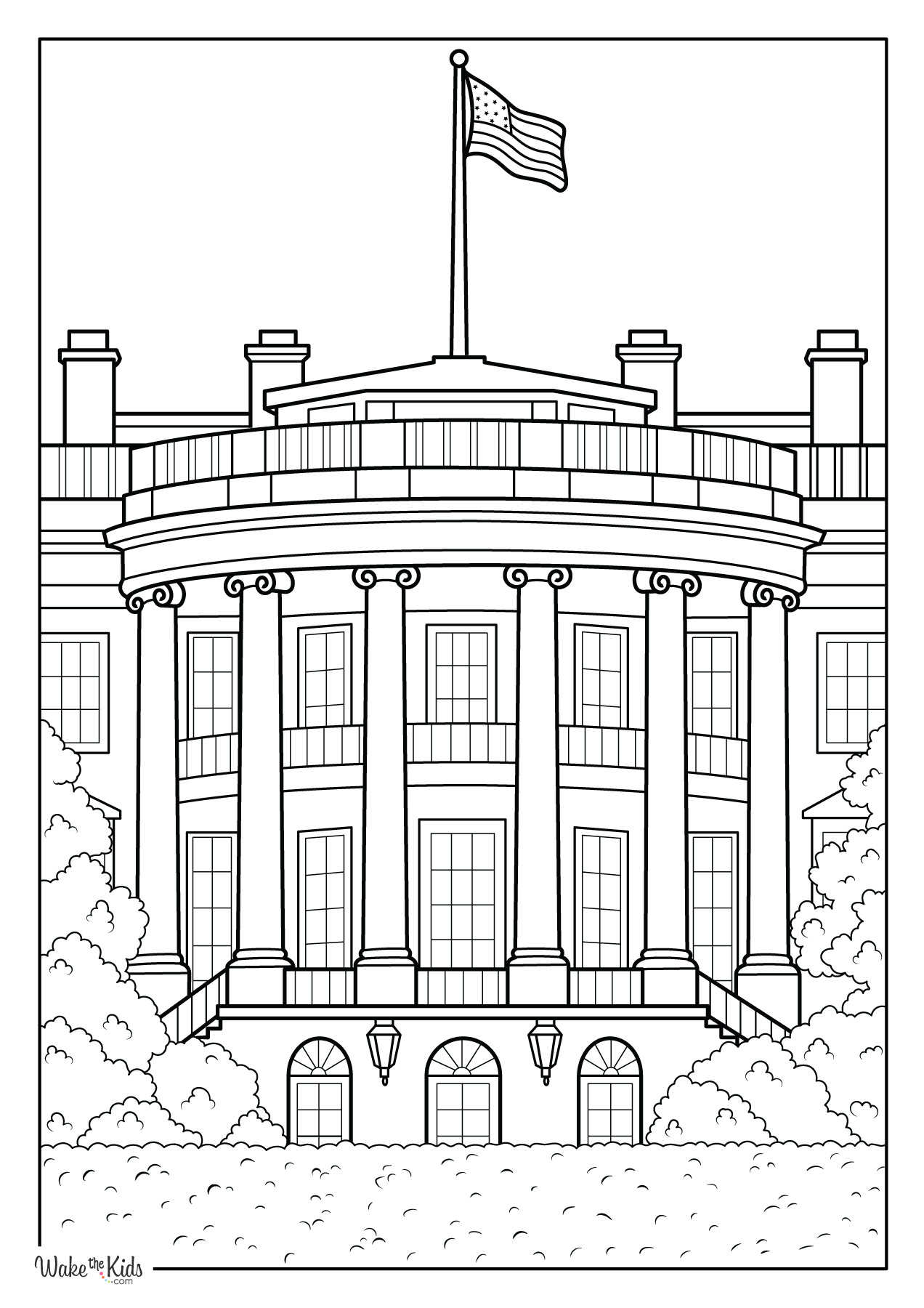 A bright neoclassical residence with tall pillars and evenly spaced windows represents one of the most recognizable government buildings in the United States. These sheets are suitable for ages 5–9 and guide learners to follow straight architectural lines, maintain steady hand movement, and observe contrasts between columns, doors, and roof sections. The building appears in clearly framed views, where major structural elements—such as pillars, steps, and window rows—remain visually distinct through careful coloring.